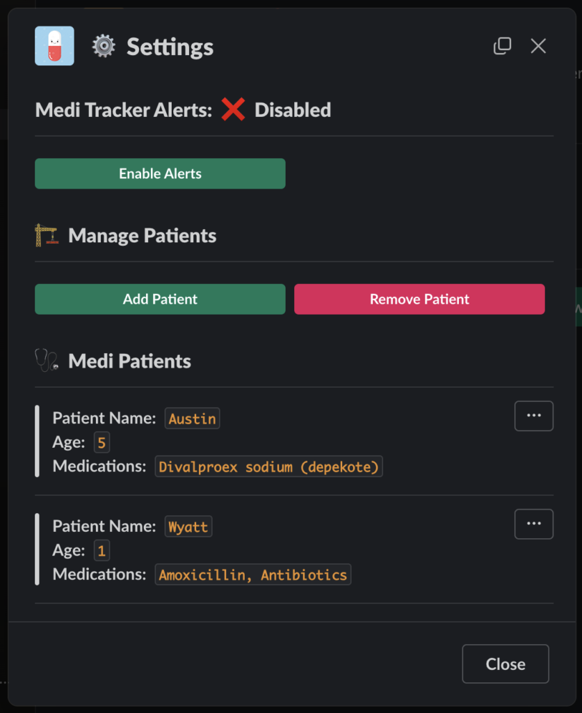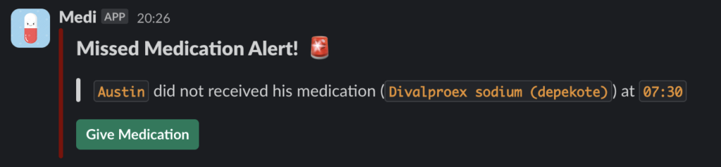 Medi leverages automation and real-time notifications to aid caregivers in the important task of medication adherence. Its seamless integration with Slack and intuitive alert system make it a valuable tool for any caregiving environment where precision and reliability in medication management are paramount.